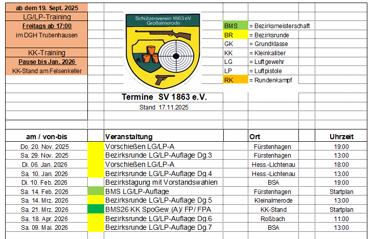 Die KK- Auflagemannschaft von SV Großalmerode gewann alle 5 Wertungsdurchgänge und wurde mit 4294 Ringen Mannschaftssieger. Platz 2 ging an den SV Kleinalmerode mit 4250 Ringen und der 3. Platz an die 2. Mannschaft von Großalmerode mit 4218 Ringe.